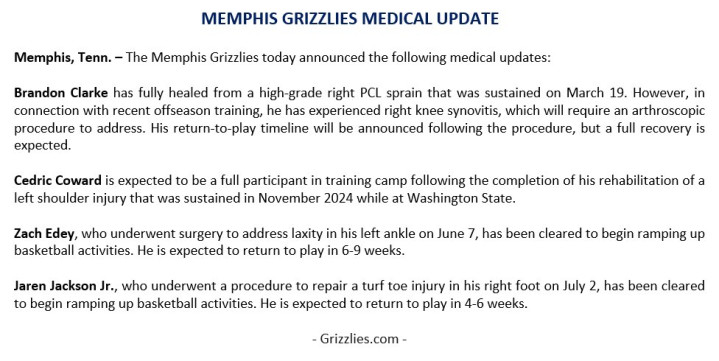 布兰登-克拉克在今年3月20日扭伤的右侧后交叉韧带已经完全康复了,然而,在近期的休赛期训练中,他出现了右膝关节滑膜炎的症状,这需要通过关节镜手术来解决。他的复出时间表将在手术后公布,但预计他会完全康复。
