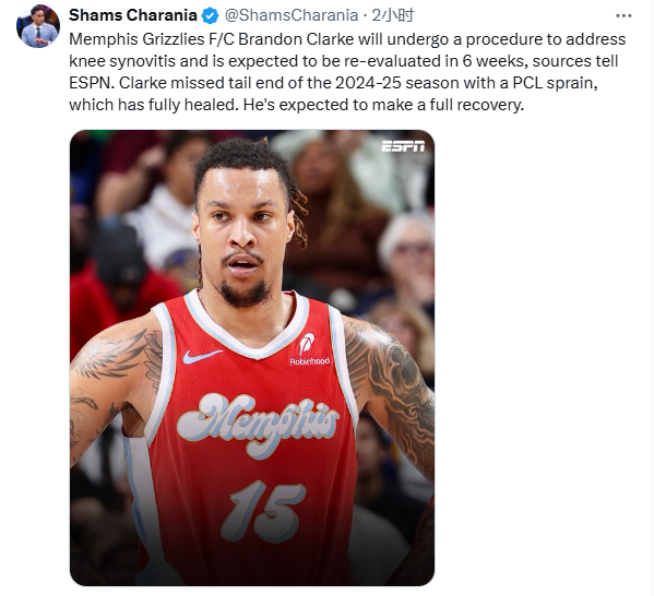 名记shams进一步报道,克拉克将接受手术,以处理膝关节滑膜炎,预计将在6周后复查。