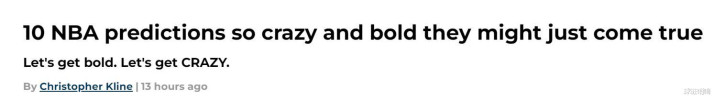 在季前赛火热进行之际,美媒《fansided》晒出对于NBA新赛季的10个大胆预测,其中包括詹姆斯赛季中期宣布退役,以及勇士队无缘季后赛。
