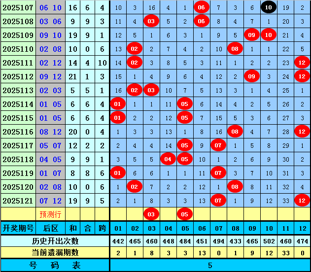 后区分析:上期后区开出全大组合:07+12,最近10期后区奖号大小比为9:11,本期预计后区开出全小组合,看好两码03、05。