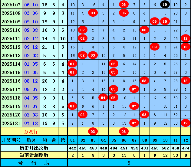 后区分析:上期后区开出奖号07和12,在最近50期开奖中,后区奖号012路落号比为30:35:35,前10期后区012路落号比为5:7:8,本期后区关注号码01、03、05、06、08,两码参考03、06。