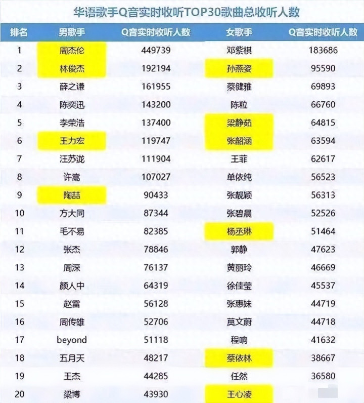 相比之下,其他女歌手虽各具特色——如孙燕姿的经典情怀、蔡健雅的创作质感、陈粒的独立气质、梁静茹的情歌统治力——但在实时收听数据上均与邓紫棋有较大差距。