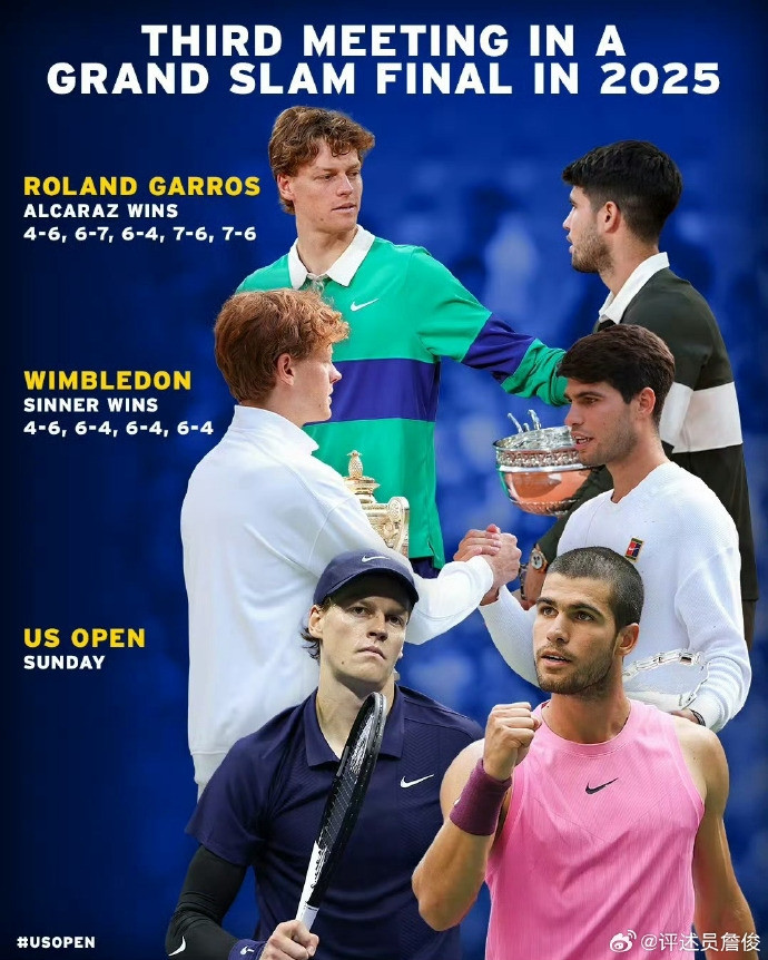 直播吧09月08日讯 2025美网男单决赛,阿尔卡拉斯3-1力克辛纳,夺得冠军。赛后著名足球评述员詹俊老师在社媒对决赛发表看法。