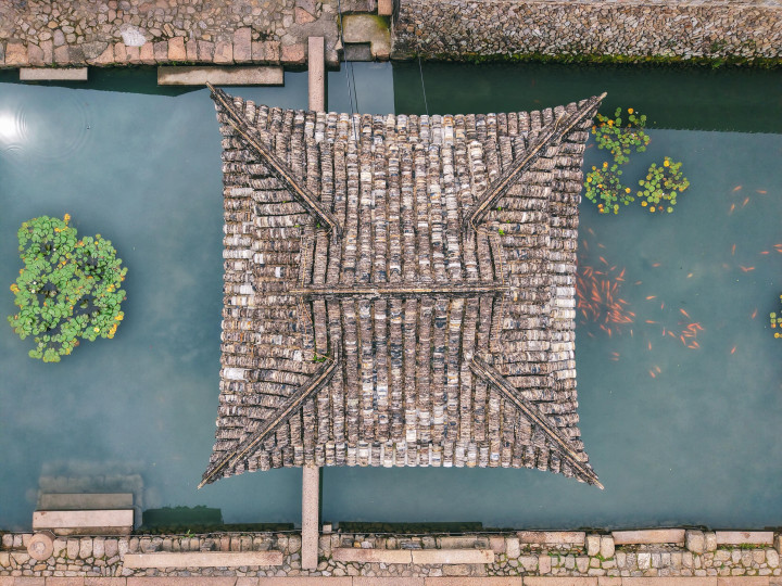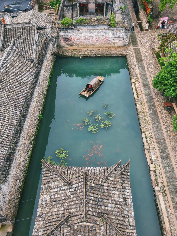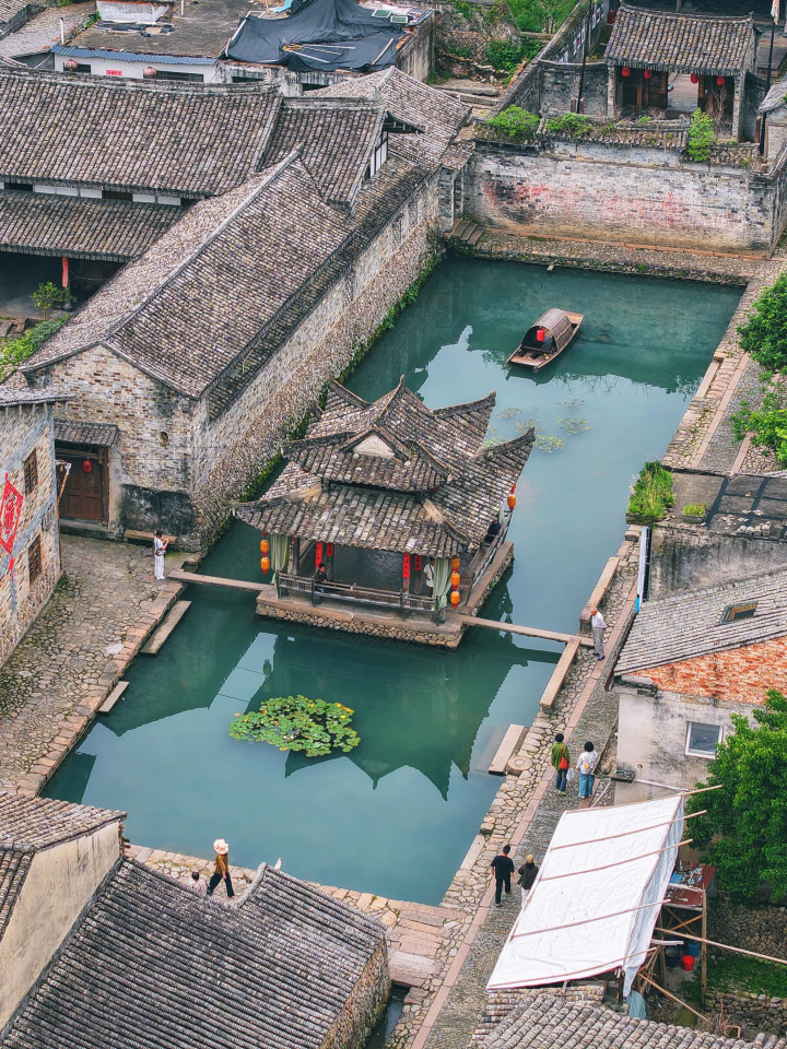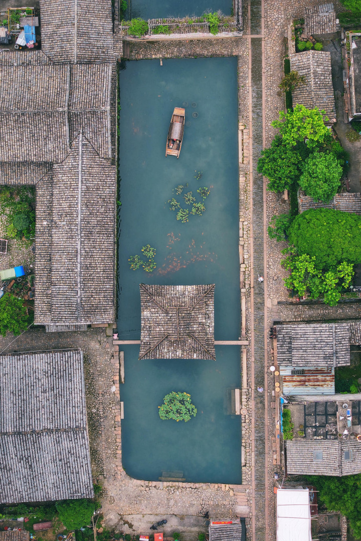 沿着卵石主街——如意街漫步,仿佛能感受到古人对美好生活的向往。这条街不仅是古村的中轴线,更是连接过去与现在的时光通道。街的中部南侧,有一泓清澈的内湖,名为“天池”,也就是村民口中的芙蓉池。池水晶莹剔透,宛如一面巨大的镜子,倒映着蓝天白云和岸边的绿树红花。池中,一座芙蓉亭亭亭玉立,它是一座两层楼阁式歇山顶的方亭,飞檐翘角,空透玲珑,像是一朵盛开的芙蓉花,又似一位遗世独立的佳人,静静地守望着这片宁静的水域。