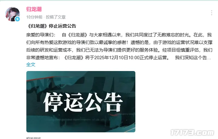 划重点:《归龙潮》12月10日停运,陪伴服务器将同步开启