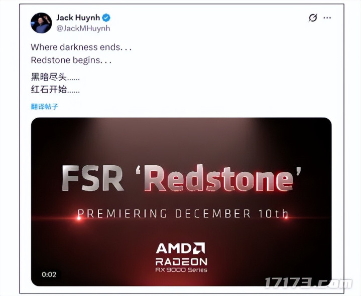 AMD计算与图形事业部的高级副总裁兼总经理Jack Huynh,于社交媒体平台发布了官方预告,明确表示FSR Redstone更新已万事俱备,且定于12月10日正式与大家见面。
