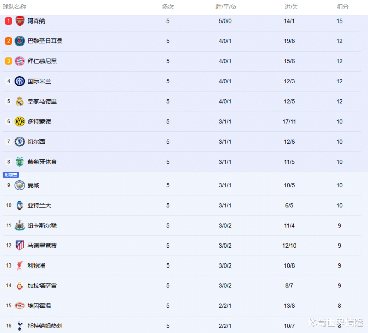 按照目前的排名和积分,阿森纳以前八的身份出线几乎已成定局,第2-5位的大巴黎、拜仁、国米和皇马均积12分,以这几支队的实力要达到16分也并不难,剩下的3个直接出线名额就比较难确定了,不少球队都有机会争取到。