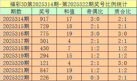 开奖回顾:福彩3D第2025322期:奖号为226,奖号质合比为2:1,大小比为1:2,跨度为4,类型为组三。